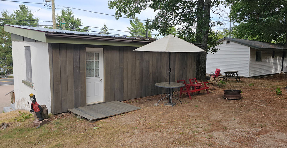 Our newly renovated glamping room comes with 2 queen beds in one large room. Furnished with a couch, chair, Table for 4, small bar fridge and outdoor patio with fire pit. The shared washroom is located a short walk from the building. LINENS ARE NOT PROVIDED, but may be added to your booking for an additional fee.